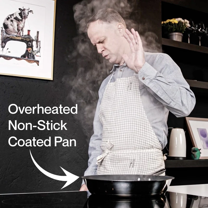 "No mucho después, accidentalmente sobrecalenté una sartén con recubrimiento antiadherente de PTFE (Teflón) antes de cocinar un bistec y me enfermé con la llamada 'Gripe del Teflón' (fiebre, tos, dolores de cabeza… no fue nada agradable). Fue entonces cuando descubrí que solo toma unos minutos para que estas sartenes antiadherentes alcancen los 500 °F y comiencen a liberar sustancias químicas tóxicas en el aire.