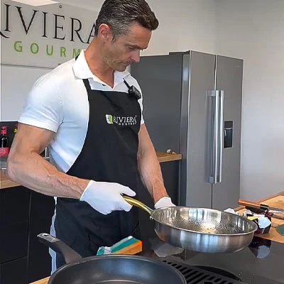 El titanio puro es químicamente estable en condiciones de cocina y preparación. Forma una capa pasivada de TiO₂ que evita que los iones metálicos migren a los alimentos.No contiene recubrimientos PFAS/PTFE, ni BPA/BPS ni plastificantes, ni níquel o cromo (como el acero inoxidable), ni núcleos de aluminio que puedan quedar expuestos.Nada se desprende, nada se degrada, nada se filtra — a cualquier temperatura de cocina.